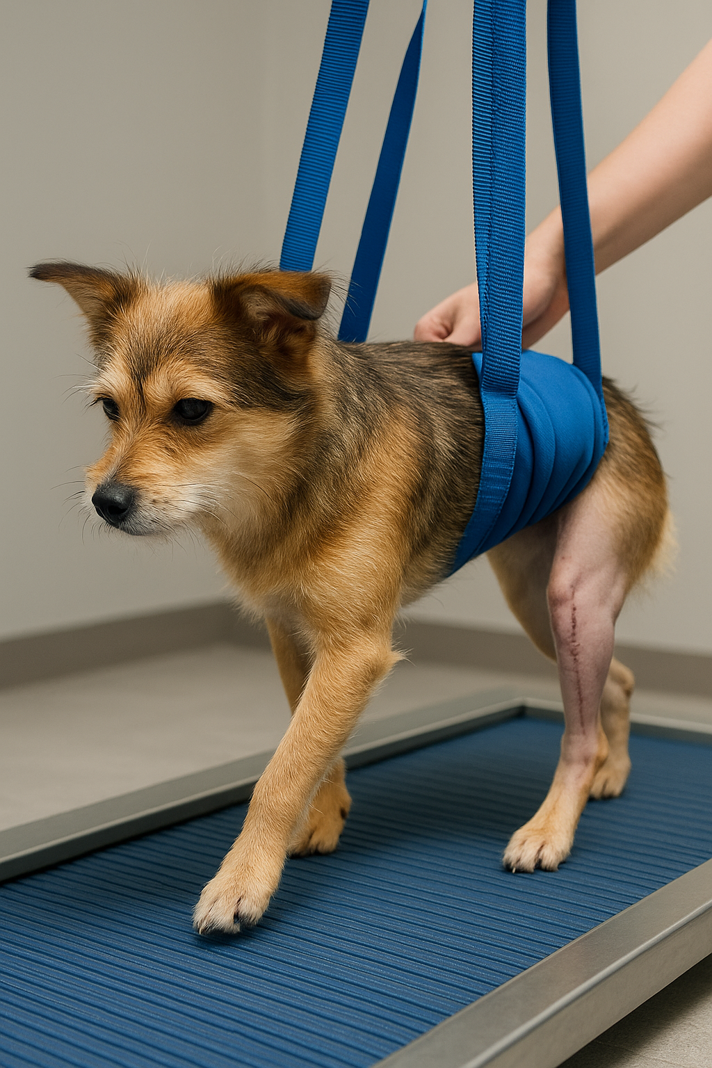 몸 아래에 수건을 감싸서 뒷다리를 살짝 들어주면서 걷게 하면, 양다리에 고르게 체중을 분산시킬 수 있습니다. 이를 통해 오른쪽 다리에 무리를 주지 않으면서도 자연스럽게 사용하는 연습을 할 수 있었습니다.